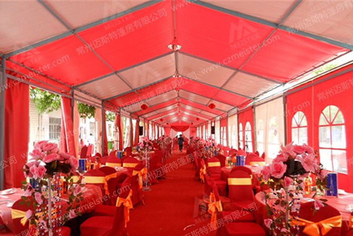 邁斯特篷房廠家生產(chǎn)的喜宴篷房采用鋁合金作為框架搭配雙面涂層PVC布具備防火阻燃、抗風(fēng)防水、抗撕拉、防紫外線等性能,紅色搭配不會顯得突兀,造型百搭,簡單大方的流線條深受新老客戶的喜愛。篷房跨度3-50m,長度可按3或5m的倍數(shù)無限延伸,如果有特殊尺寸需求,還可以根據(jù)客戶的要求量身定做。若有這方面的需求可以聯(lián)系邁斯特篷房廠家相關(guān)人員。