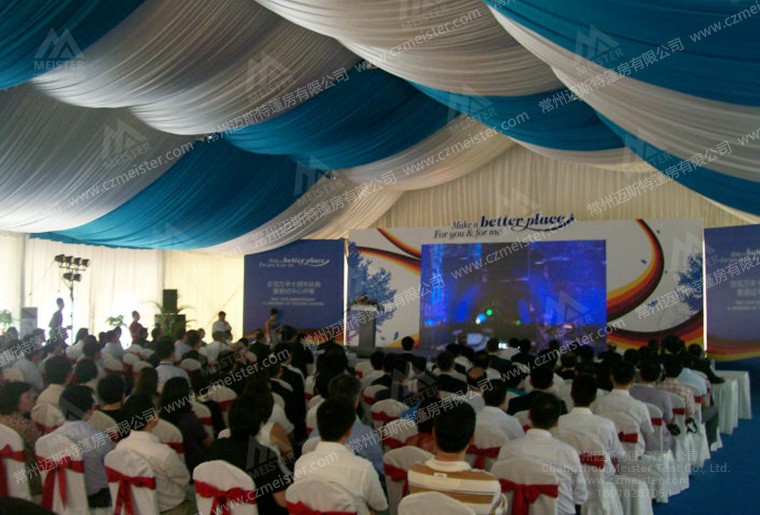 除了經典的篷房外形能夠吸引客戶以外,邁斯特篷房的內在也是精益求精,有布幔、空調、燈具、地板、桌椅等,能夠讓展會更具吸引力的同時,也能夠讓我們的篷房功能更加強大。在場地安排方面,我們可以增加邊高或頂高,來滿足您大型物件的展示;在安全方面我們可以安裝排水槽來防止積水等等。邁斯特家居展帳篷同其他篷房產品一樣,可以安全穩(wěn)固的抗風防雨防曬,為展覽會活動保駕護航。