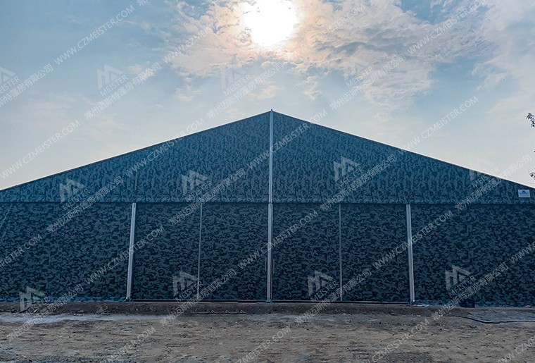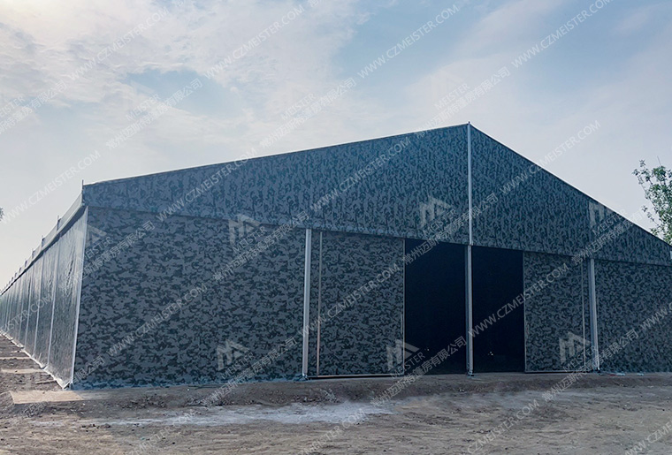 倉(cāng)庫(kù)篷房近年來(lái)非常受歡迎,不僅是因?yàn)樗軌蛴脕?lái)簡(jiǎn)單地存儲(chǔ)貨物,更重要的是它能夠幫助企業(yè)解決淡旺季時(shí)的倉(cāng)儲(chǔ)難題。鋁合金篷房采用高強(qiáng)度的鋁合金框架,能夠確保產(chǎn)品結(jié)構(gòu)穩(wěn)固耐用,而篷布的顏色也是可以定制的。這一款就是跨度20米的迷彩色倉(cāng)庫(kù)篷房,其迷彩色不僅具有很好的偽裝效果,還能夠有效抵御紫外線以及風(fēng)雨等其他自然現(xiàn)象的侵襲,能夠有效保障內(nèi)部物資安全。
