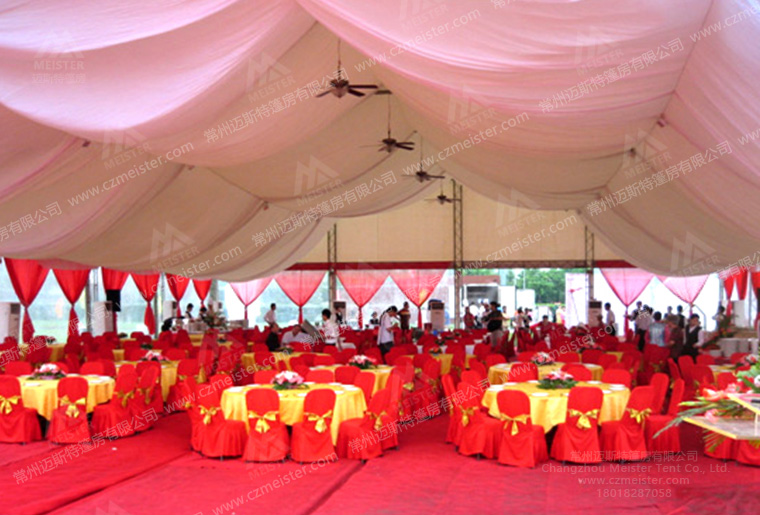 在配套設(shè)施方面,邁斯特廠家提供雙面涂層PVC篷布(白色或紅色),玻璃幕墻,布幔、舞臺、燈光、桌椅等,能夠讓您在篷房內(nèi)就能得到酒店般的體驗。這是一款跨度15米的婚慶篷房,具有完善的配套設(shè)施,為賓客們提供一場難忘的婚禮宴會。